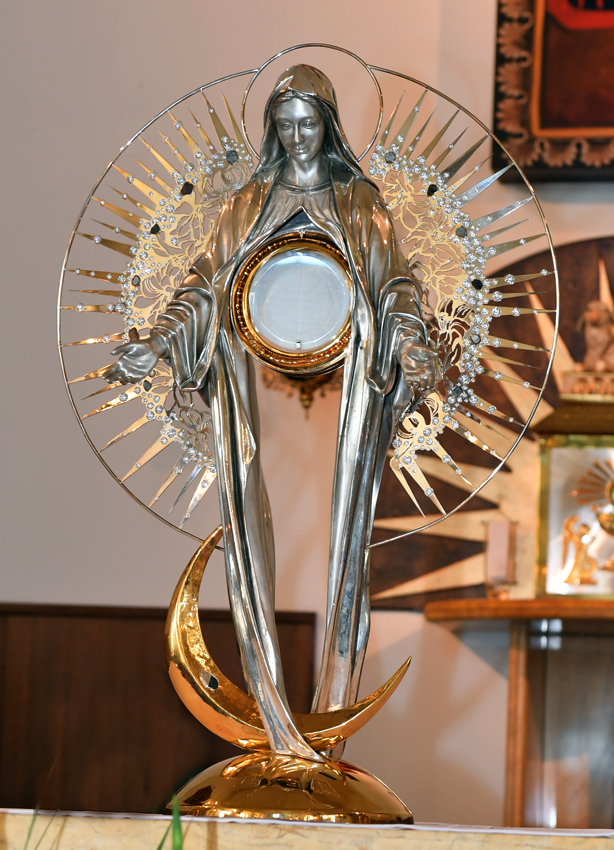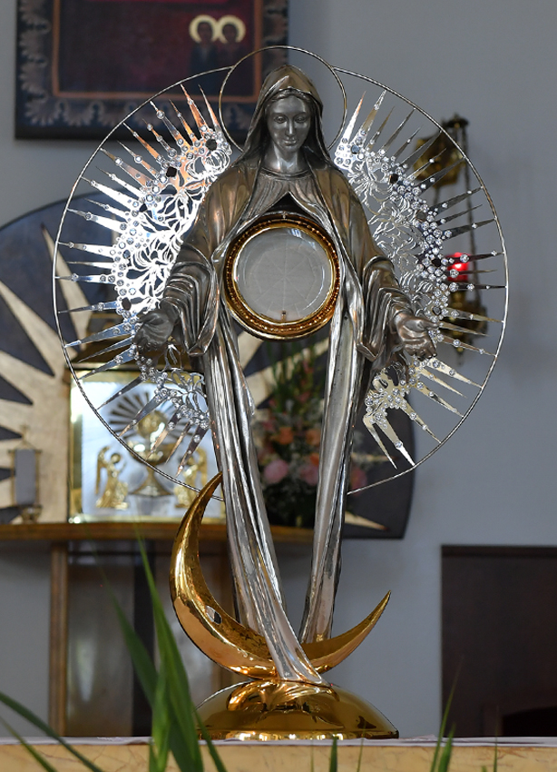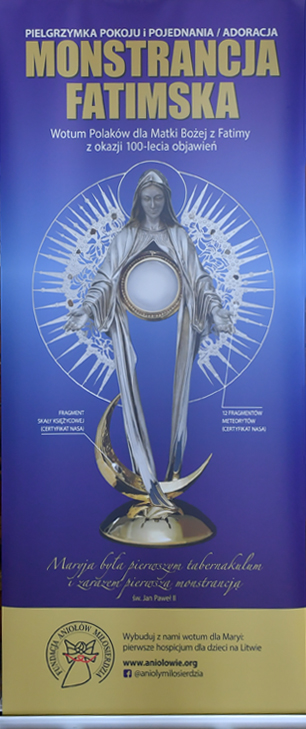 Monstrancja przypominająca postać Niepokalanej, jest darem Polaków dla fatimskiego sanktuarium, w 100. rocznicę objawień. Zanim zostanie przekazana do Fatimy, peregrynuje po polskich parafiach, przypominając o fatimskim przesłaniu, nadal aktualnym wezwaniu do modlitwy o pokój, do nawrócenia oraz o potrzebie miłosierdzia.